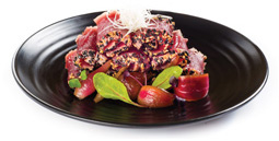 Zprudka opečené plátky tuňáka v sezamové krustě s yuzu-ponzu omáčkou