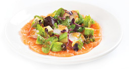 Plátky z lososa se sakura mixem, avokádem a sezamovo-sójovým dresinkem
