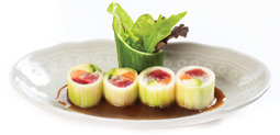 Tuňák, losos, mořský vlk, avokádo a kaviár z létající ryby zabalené v okurce
