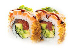 Uvnitř – Smažená kreveta v těstíčku, losos, tuňák, Philadelphia sýr, avokádo, okurka, krabí krém